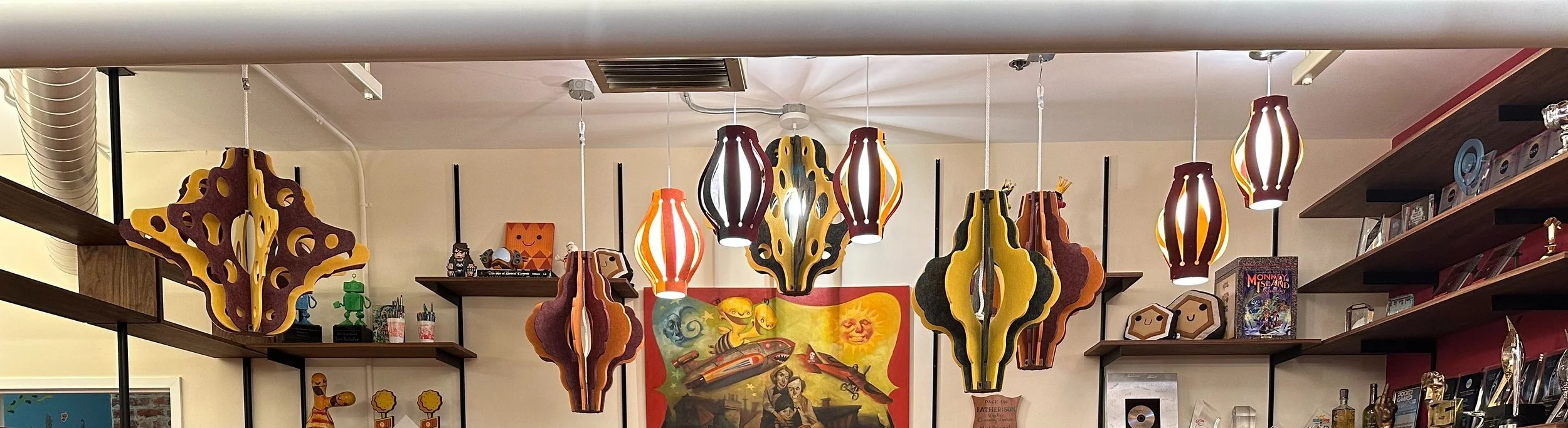 To infill the smaller spaces and add some lighting diversity and interest, we designed and fabricated a smaller felt fixture as well, using a thinner more flexible material in a layers with a slumping affect.