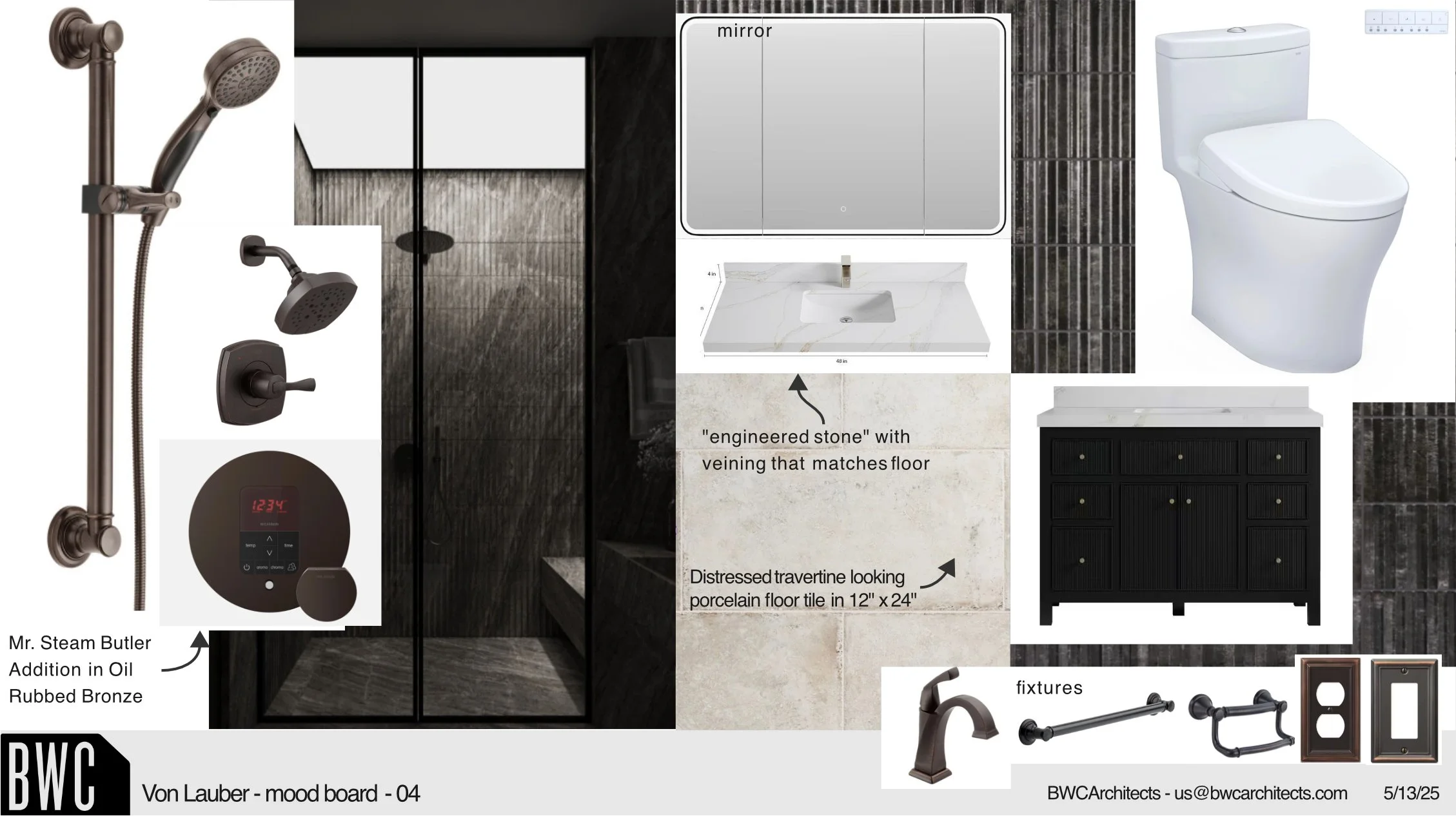 Below our final mood board with the chosen set of fixtures, finishes, and products. Once these choices are defined, we review the design drawings and renderings alongside the actual product samples with the client to ensure complete aesthetic alignment.