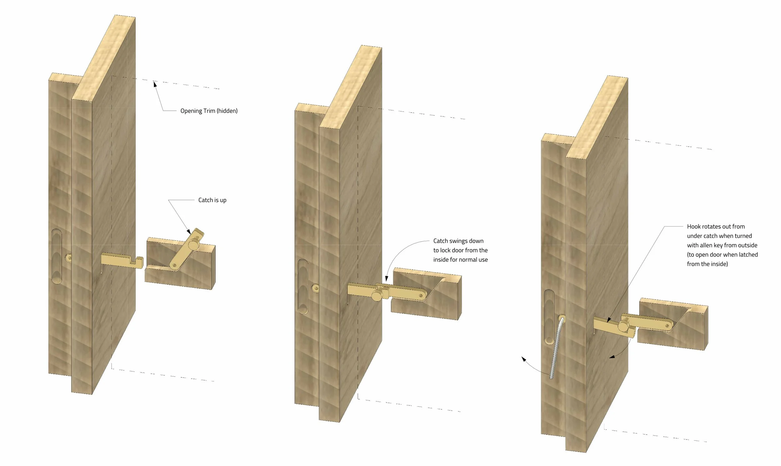 Designs for the custom lock / latch for the bathroom door allows a safety mechanism to unlock the door from the outside - while remaining completely hidden on the slat wall - so the secret door illusion is not broken