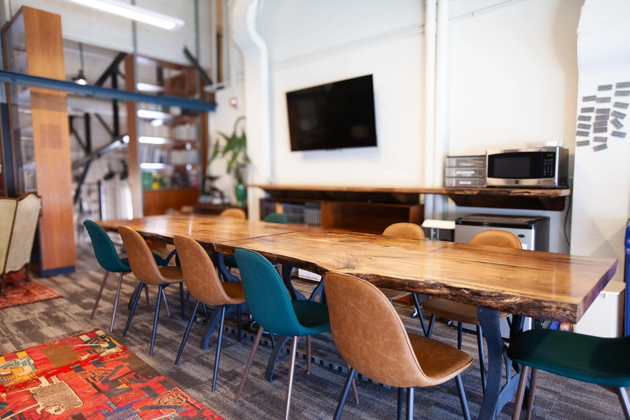 As part of our business practice, we have a fabrication shop that makes custom elements for our projects. Adding the live edge walnut table and countertop from salvaged hardwood slabs created anchor point for this small office space, and was also a relevant thinking point for the space, as it can reference projects the organization is working on. We processed, treated and fabricated the final pieces of the hardwood slabs in our shop in Oakland CA to make these one of a kind pieces.